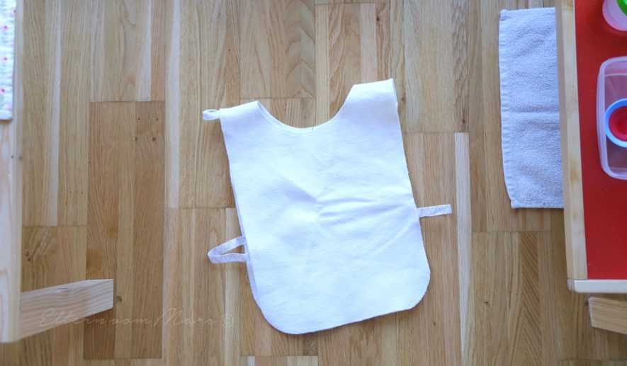 Перед началом занятий предлагайте ребёнку надевать фартук. Кроме практических целей — не заляпать одежду краской, клеем или тестом, — этот ритуал как бы говорит малышу, что сейчас будет происходить что-то особенное. Выбирайте простой фартук: с одной лентой, которую ребёнок сможет закрепить липучкой.