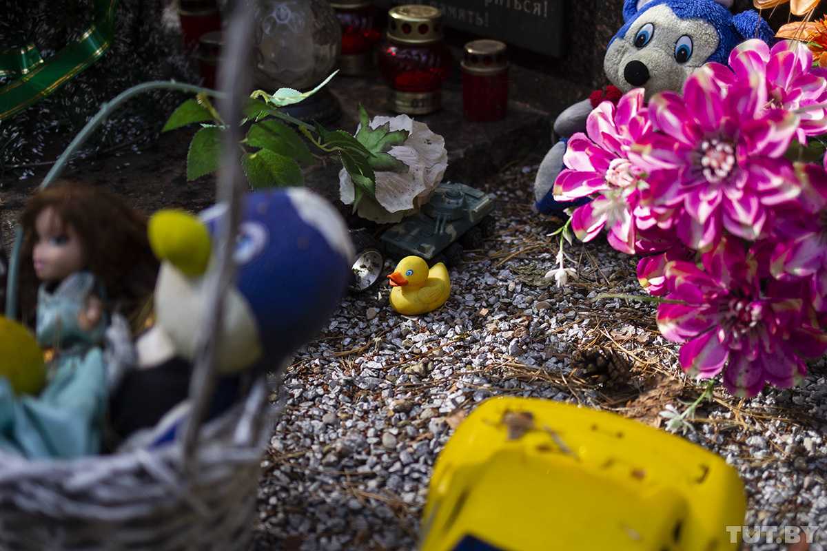 Под крестом люди оставляют детские игрушки