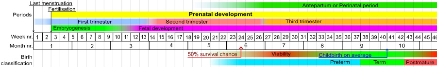 Для описания пренатального развития используются разные термины , означающие развитие до рождения . Термин с тем же значением — «дородовой» (от латинского ante «до» и parere «рожать»). Однако иногда термин «дородовой» используется для обозначения периода между 24/26 неделями гестационного возраста до рождения, для пример в дородовом кровотечении .