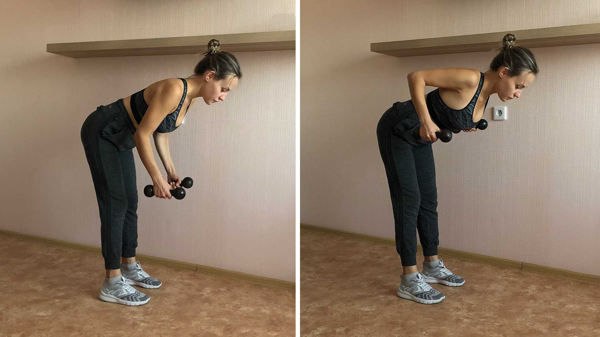 - В среднем темпе начинайте протягивать одну гантель к туловищу. В верхней точке амплитуды гантель должна располагаться на уровне мышц пресса. На пике движения следует выдержать паузу и только потом вернуть вес в исходное положение.