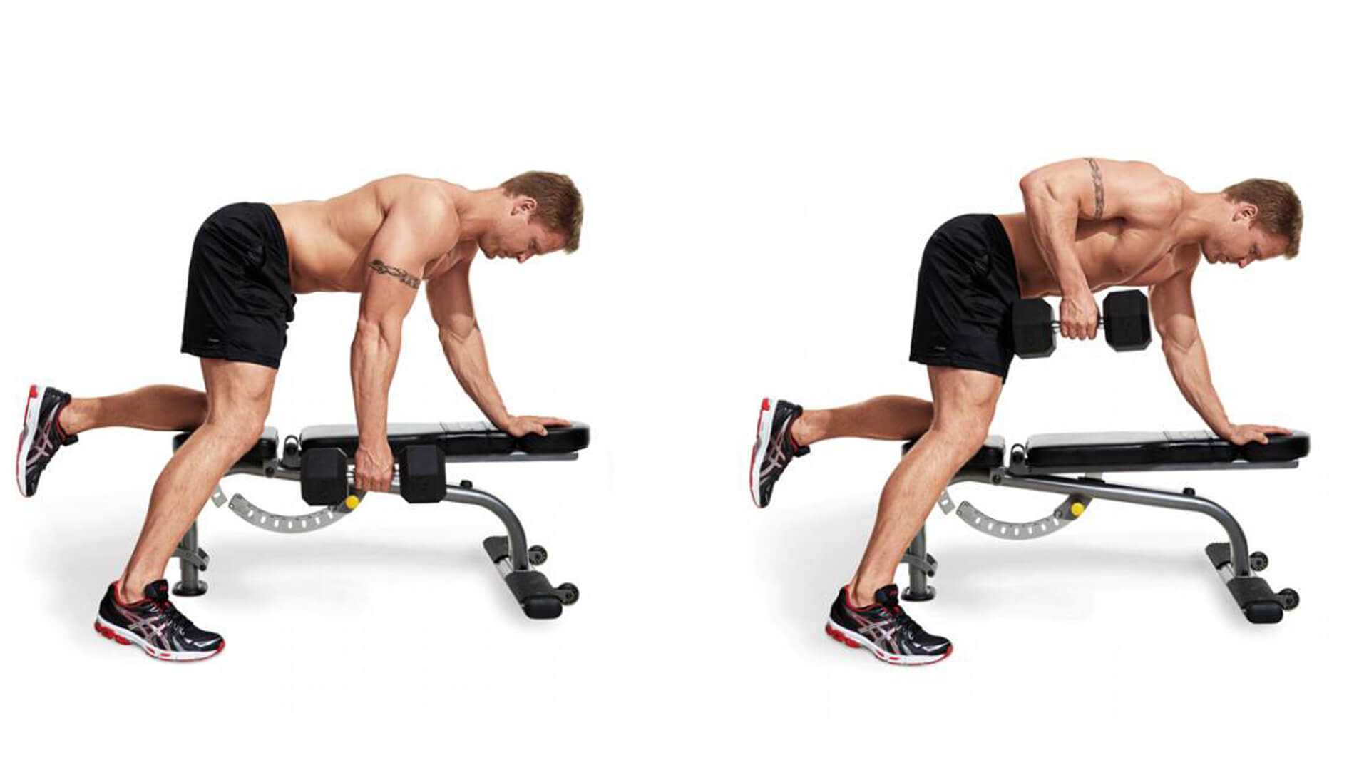 - Исходное положение следующее: упритесь коленом и ладонью в скамью или другую возвышенность. Вторая нога является опорной и должна находиться позади скамьи. Для лучшего равновесия ее нужно отставить в сторону. Рабочая рука находится под плечевым суставом. Корпус расположен параллельно полу с прогибом в поясничном отделе.